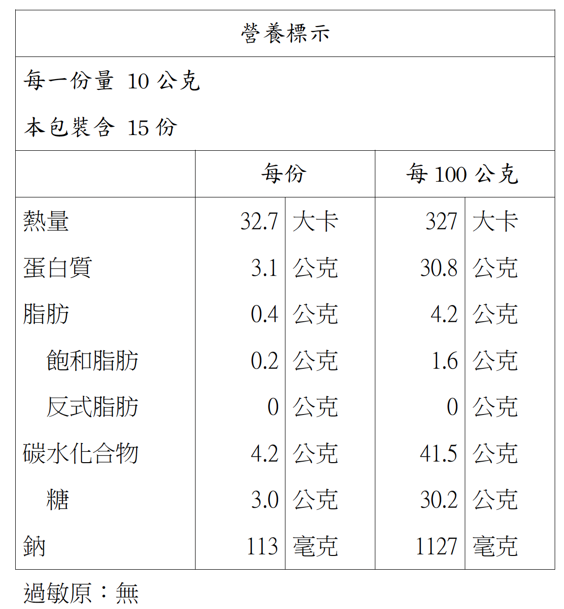 豬肉(台灣)、糖、甘油、D-山梨醇液70%(甜味劑)、鹽、高梁酒(高粱、小麥)、青花桂末、白胡椒、多磷酸鈉、偏磷酸鉀、異抗壞血酸鈉(抗氧化劑)、紅麴萃取物、糊精